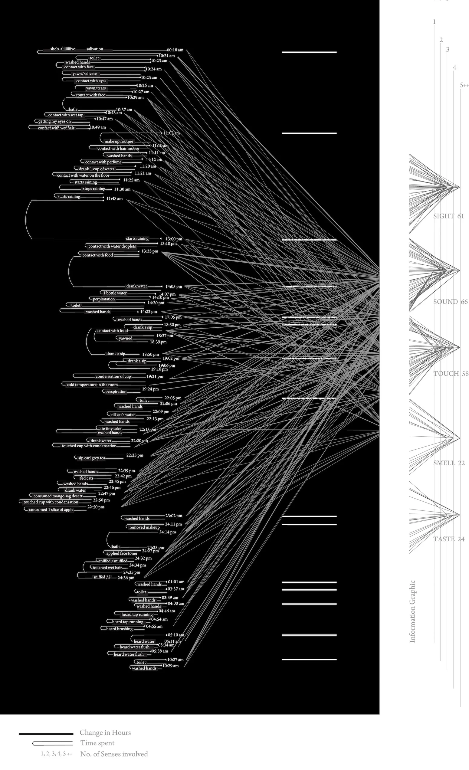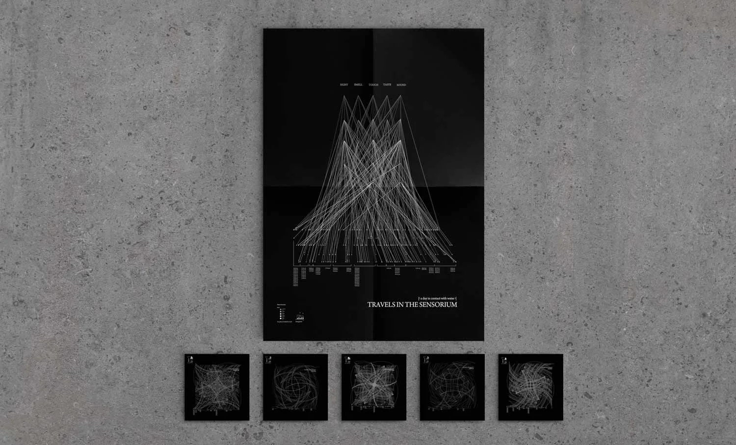 Travels in the Sensorium are a series of information graphic posters that depicts the journey of ‘a day in contact with water.’ The visual maps are a series of five infographic images based around the topic ‘a day in contact with water.’ Through research and data collection, developments have been made around the theme of “Synaesthesia.” The visual maps are based around this idea of how one sense triggers another sense, and how each sense is interrelated coherently. There are five senses that we feel all around us. These sense are those of touch, smell, sight, taste, and sound.